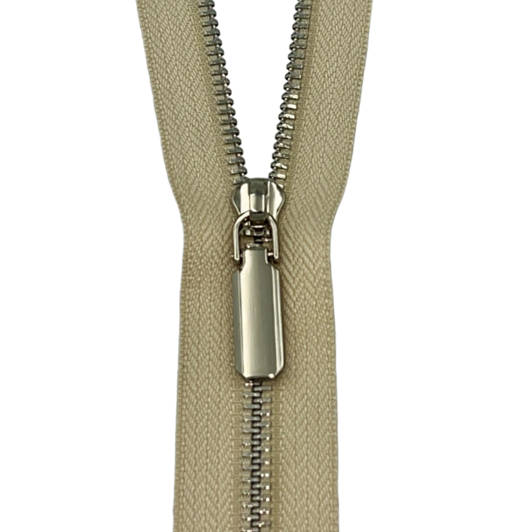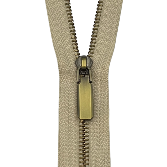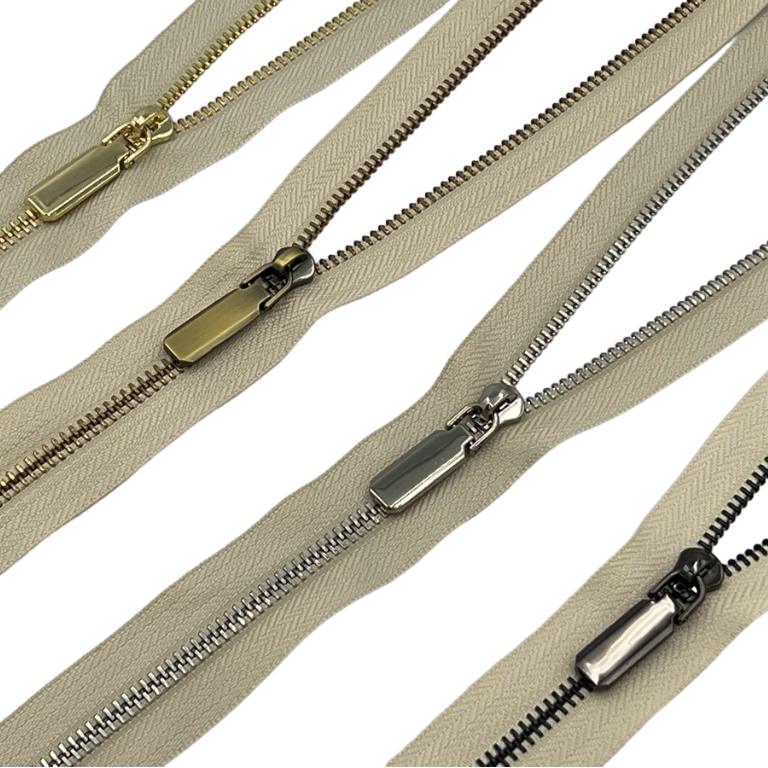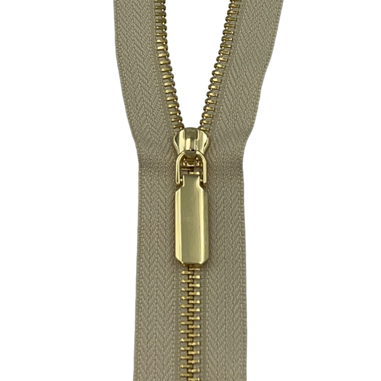 3. ซิปฟันทองเหลือง (Brass Zipper) เป็นซิปที่ให้ความหรูหราสวยงาม วัสดุฟันซิปทำจากทองเหลืองซึ่งมีความแข็งแรงคงทน ข้อดีคือไม่ขึ้นสนิม แต่มีราคาที่ค่อนข้างสูง ให้ภาพลักษณ์ทันสมัยสวยงาม โดยนิยมนำไปใช้กับงานกระเป๋า เครื่องหนัง กางเกงยีนส์ แจ๊กเก็ต ฯลฯ